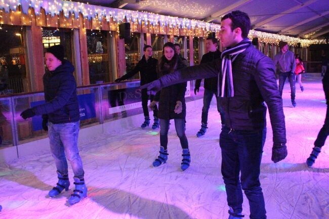 Wat is de beste manier om het nieuwe jaar te beginnen? Met de In Duplo Winteractiviteit natuurlijk! En dit jaar stond er iets speciaals op de agenda, namelijk met z’n allen schaatsen bij Winterland Schiedam! Op woensdag 4 januari, rond een uur of 5, verzamelden ongeveer 30 In Duplo’ers zich op het treinstation van Schiedam om daarna samen te vertrekken richting de schaatsbaan. Na een ritje met de tram en een korte wandeling kwamen we aan op onze bestemming. Het weer was verre van gezellig, maar dat kon de sfeer niet drukken en gelukkig was de schaatsbaan overdekt! Maar voordat het schaatsen kon beginnen was het eerst tijd voor wat te eten. Dankbaar ging iedereen het Winterland Café binnen, dat nog helemaal in kerstsfeer was, en al snel hadden de In Duplo’ers een plekje veroverd. Het was ondertussen al 6 uur geweest en iedereen was uitgehongerd, dus toen de frietjes en snacks werden geserveerd viel men hongerig aan. Binnen no time was iedereen uitgegeten en was het tijd om een paar prachtig blauwe schaatsen aan te trekken en kon het schaatsen beginnen!