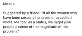 Die verandering is nu al een paar weken door de #MeToo bezig. Vrouwen en later ook mannen onthullen hun ervaringen met seksuele intimidatie. Dit kwam op gang door een tweet met deze bijbehorende foto.