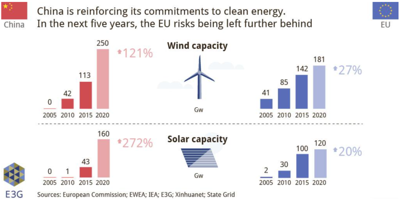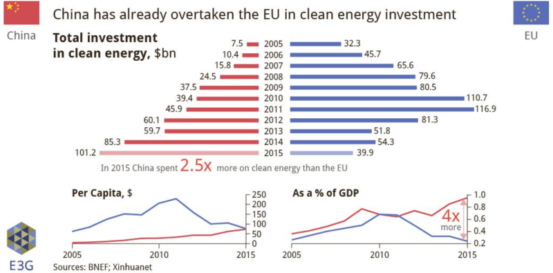 China investeert jaarlijks meer dan twee keer zoveel in schone energietechnologieën als de EU. Terwijl in de EU de afgelopen jaren de investeringen in duurzame energie zijn afgenomen, namen deze in China alleen maar verder toe. Het staatsoliebedrijf China National Petroleum Cooperation (CNPC) – de Shell van China – neemt hierin zelfs het voortouw. Inmiddels is China marktleider in het produceren van zonnecellen; 66% van alle zonnecellen wereldwijd komen uit China. In zowel wind- als zonne-energie heeft China de grootste capaciteit ter wereld. Daarnaast is de wereldprijs van zonnepanelen in enkele jaren met 80% gedaald dit is te danken aan China’s enorme schaal van productie.