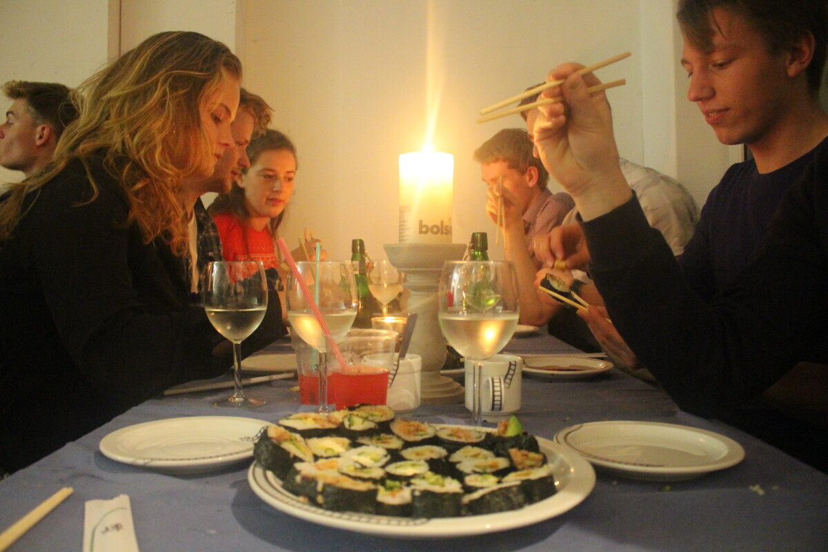 Gisteravond stond volledig in het teken van de kunst der sushi rollen. Dit deden we dan ook in overvloed. Gefocust werd er ruim anderhalf uur gerold met de bamboe matjes. En het resultaat mocht er zijn; er was genoeg voor heel Rotterdam en omstreken. Niet alle rollen waren moeders mooiste, maar het smaakte allemaal hemels. Nadat we allemaal opgeleid waren tot echte maki-masters moesten er natuurlijk ook nog wat drankspelletjes gespeeld worden. Dit gebeurde alleen niet met de Sake wijn, want we waren het er unaniem over eens dat die niet te drinken was. De welbefaamde Slush machine kwam hier dan ook goed van pas! Het roodkleurige kindersentiment met mierzoete geur werd ruim gemixt met vodka. Dit gebeurde allemaal onder toezicht van Ize, die er met trots constant voor zorgde dat alle bekers gevuld bleven.