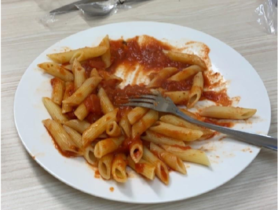 Dit was mijn eerste maaltijd in quarantaine: Penne met Bolognese saus uit een potje, en zoals je ziet: geen groente.