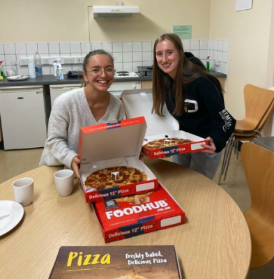 Dit ben ik (rechts) met mijn vriendin Léna (links). We hebben hier in quarantaine pizza besteld om te vieren dat de quarantaine bijna voorbij was. Na al dat saaie eten, ging dit er goed in!