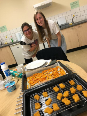 Hier ben ik met mijn vriendin Kim (links). Ook hier mag quarantaine de pret niet drukken. We hebben zelf zoete aardappelfriet en kipnuggets gemaakt echt super!